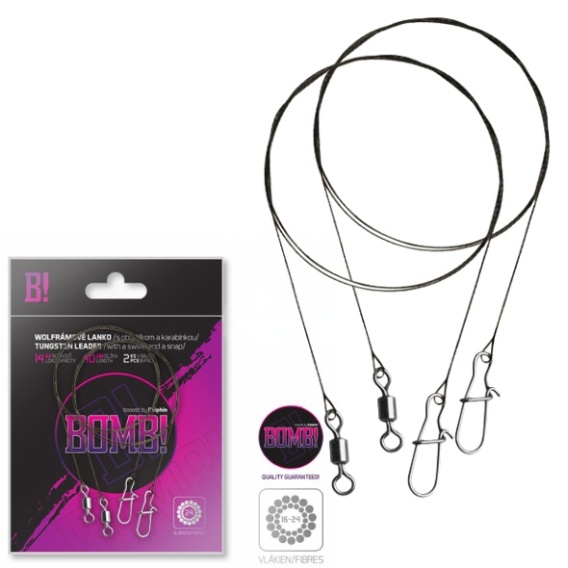Leadery spinningowe serii BOMB! od firmy Delphin wykonane z kilkunastu splecionych włókien wolframowych. Skład i materiał przyczyniają się do wytrzymałości i odporności na uszkodzenia. Dzięki swej delikatności doskonale nadają się do naturalnej prezentacji przynęty w wodzie. Żyłka jest zakończona z jednej strony krętlikiem a z drugiej agrafką typu Snap, ułożoną w pętli. W każdym opakowaniu znajdują się dwie sztuki tej mocnej żyłki!